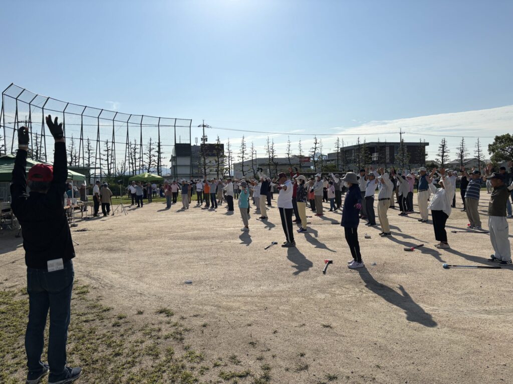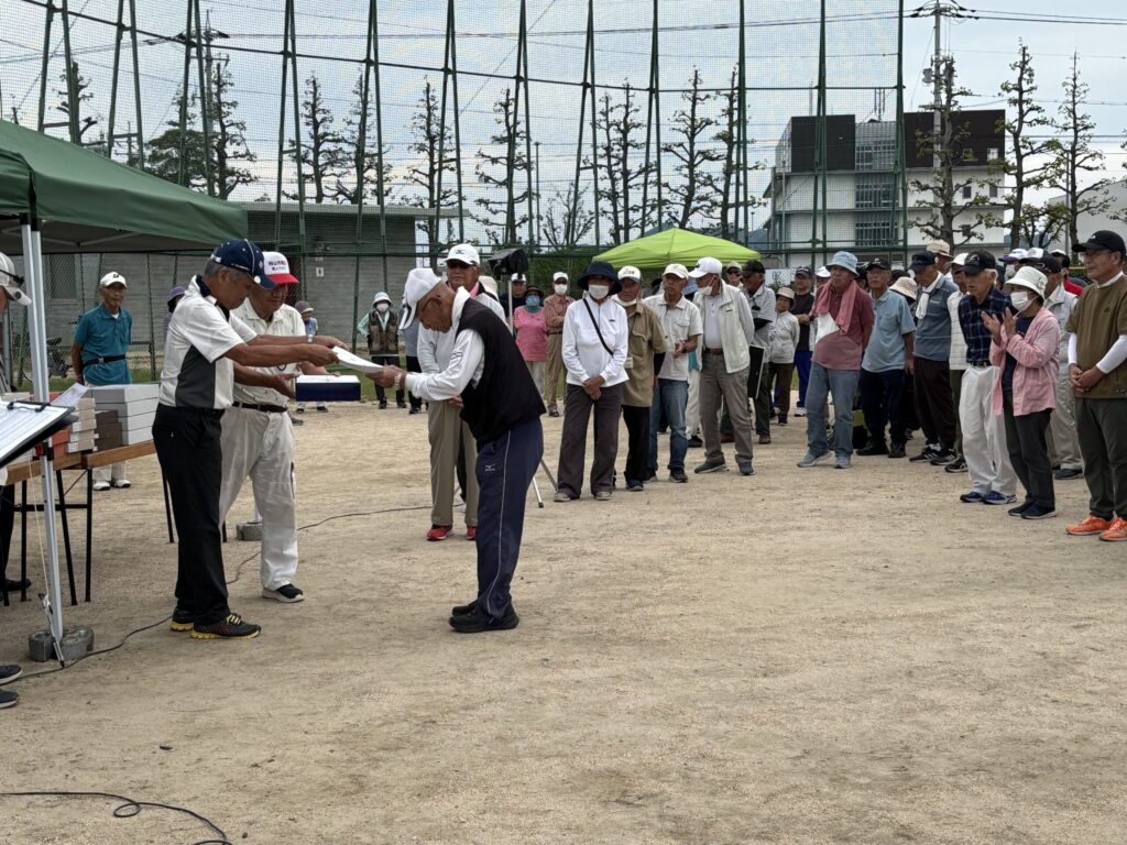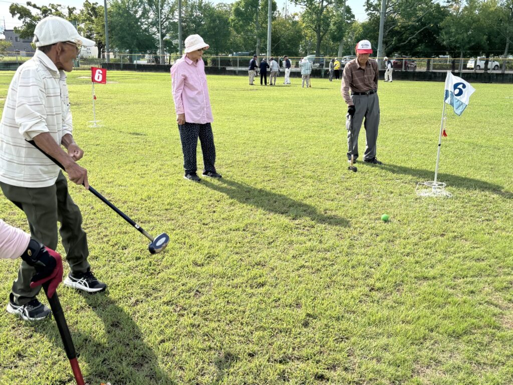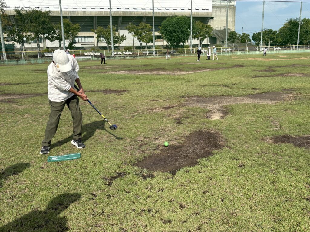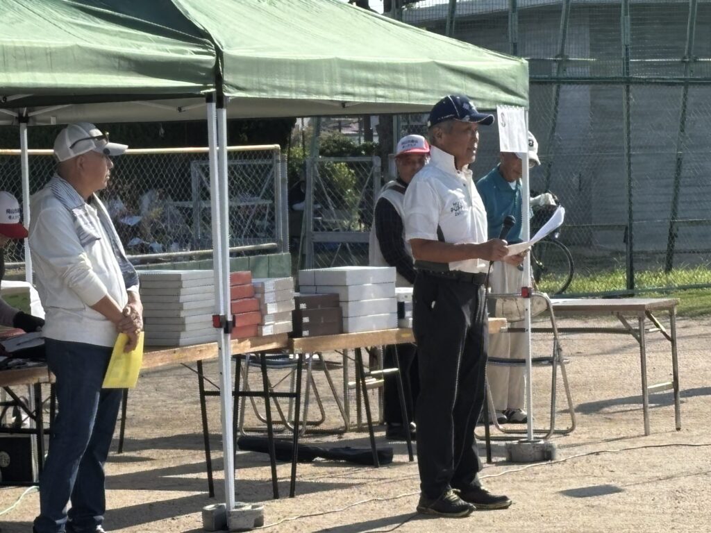南区老人クラブ連合会の健幸づくりグラウンド・ゴルフ親睦交流大会が開催されました 令和7年10月2日(木)に浦安公園軟式野球場で第12回健幸づくりグラウンドゴルフ親睦交流大会が開催されました。 参加者210人が8ホールの2ラウンドをプレーし熱戦を繰り広げるとともに親睦と交流を深めました。 戸田会長の開会あいさつ 準備体操でラジオ体操第1♪ 芝生がデコボコでなかなかボールが思うところに転がりません 大会の上位成績は下記のとおり 優 勝 森藤大五郎(第1藤田学区) 準優勝 宮岡 勲(平福学区) 第三位 後藤 亢美(南輝学区)