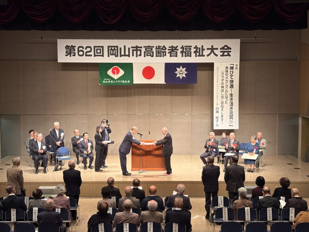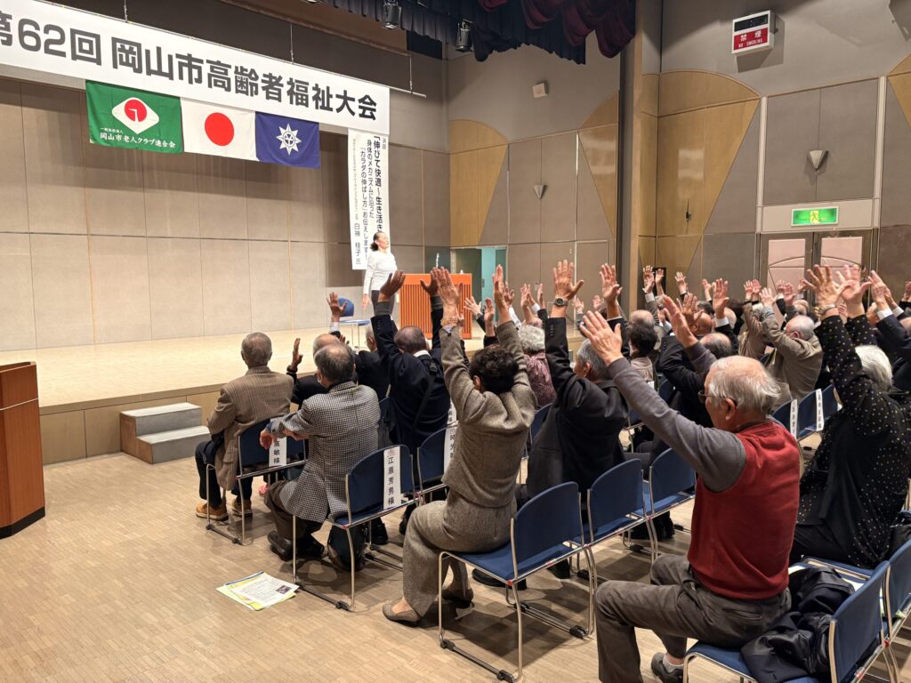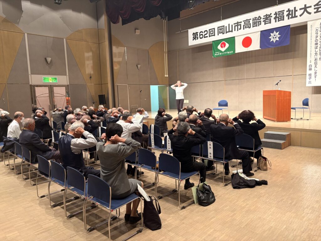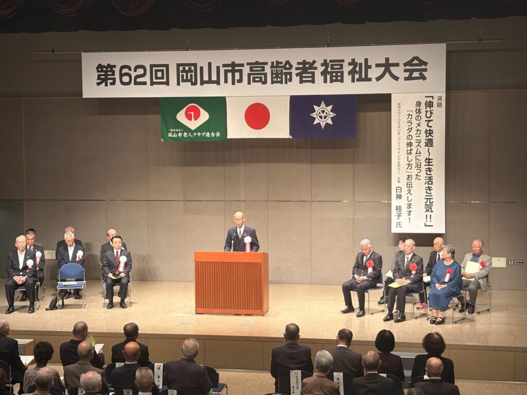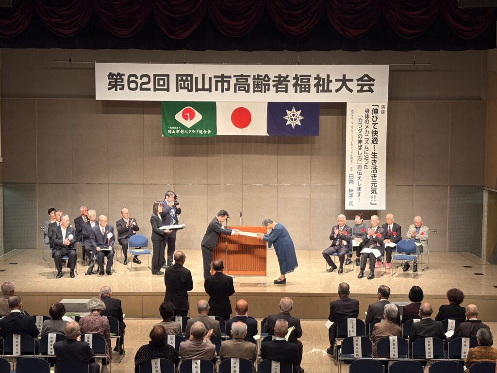 第62回岡山市高齢者福祉大会を開催しました 令和7年11月11日(火)西川アイプラザ多目的ホールで第62回岡山市高齢者福祉大会を開催しました。 岡山市老人クラブ連合会会長表彰 老人福祉功労者 8人 老人福祉協力者 24人 岡山市長感謝状 老人福祉功労者 5人 優良老人クラブ 1団体 式典終了後、ボディワークスタジオ「フリーマインド&ボディ」主宰 白神桂子様をお招きし、「伸びて快適~生き活き元気!!」身体のメカニズムに沿った『カラダの伸ばし方」お伝えします! の演題でお話をしていただきました。