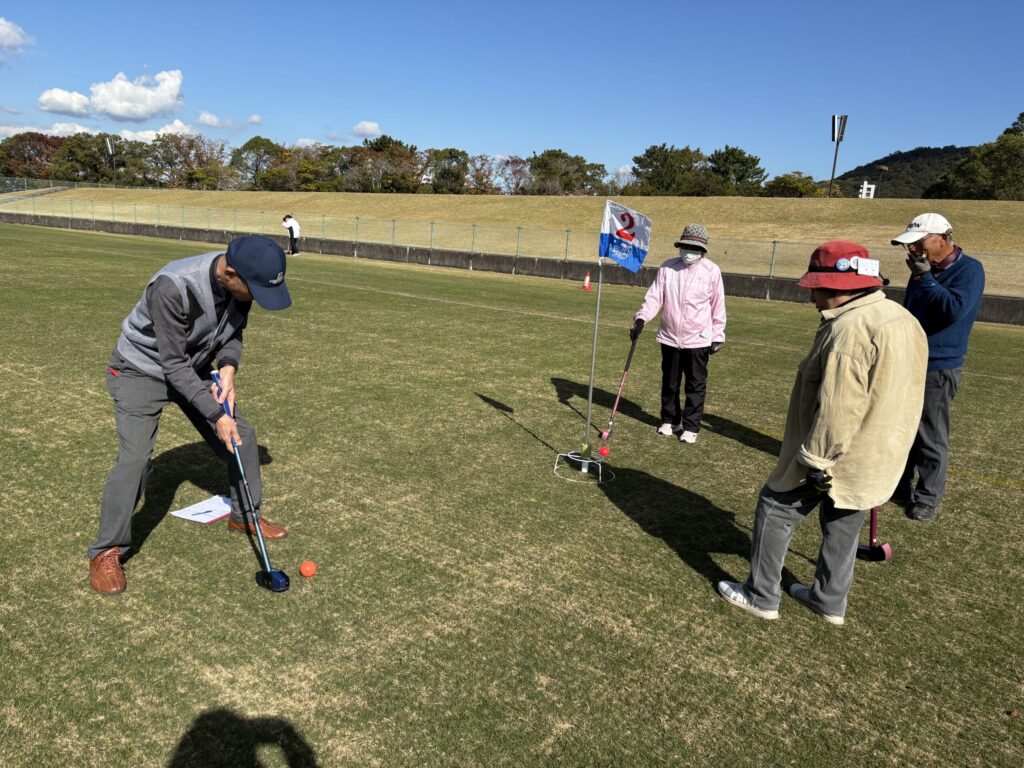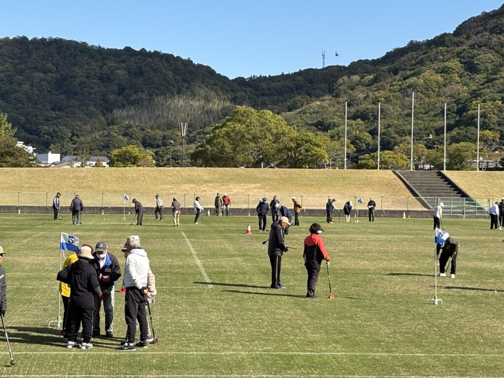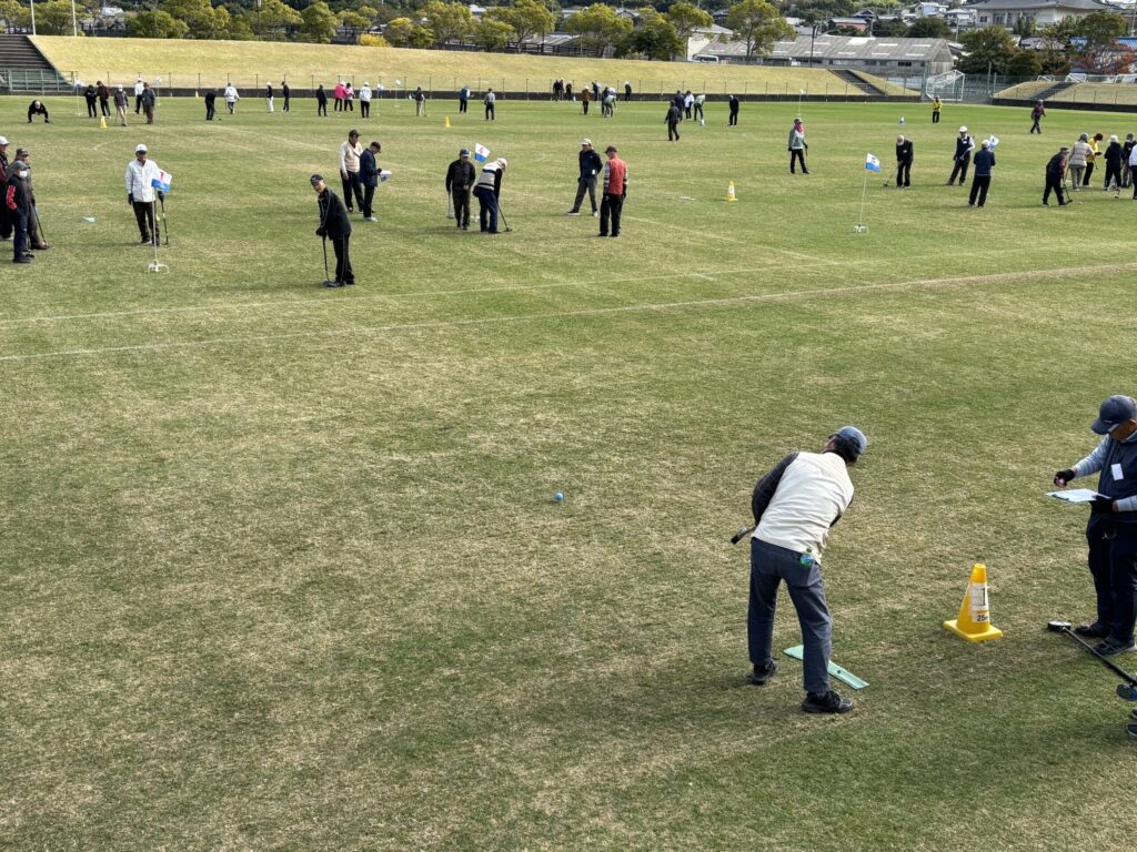 会場はサッカー・ラグビー場の芝生コース。高松市老連の参加者と一緒に8コースの3ラウンドをまわり親睦と交流を深めました。