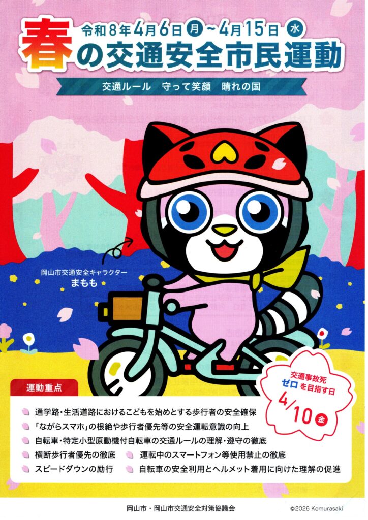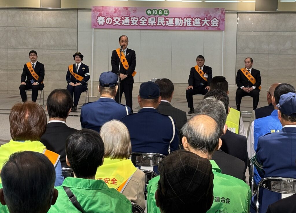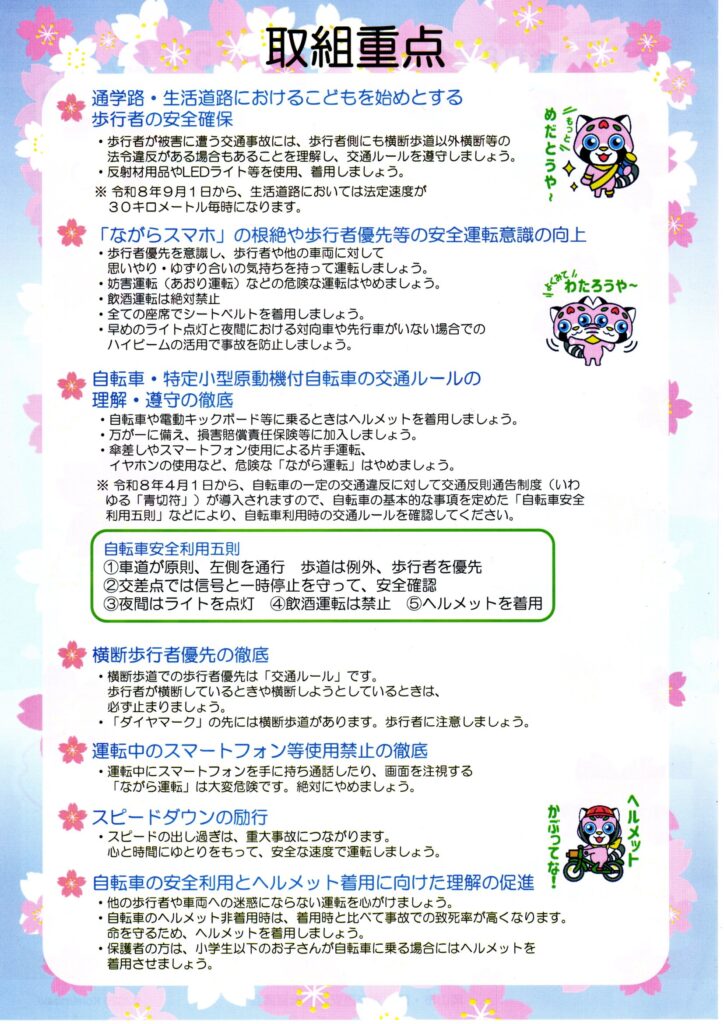 春の交通安全市民運動が始まりました 令和8年4月6日(月)~4月15日(水)は春の交通安全市民運動週間です。 スローガン 「交通ルール 守って笑顔 晴れの国」 令和8年4月6日(月)に春の交通安全県民運動推進大会が開催され、高橋会長他5人の役員が出席しました。 7つの運動重点項目があります。お読みいただきご協力をお願いいたします。